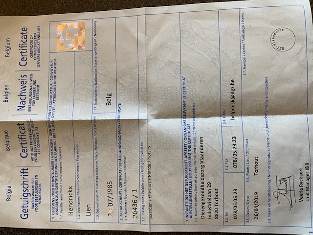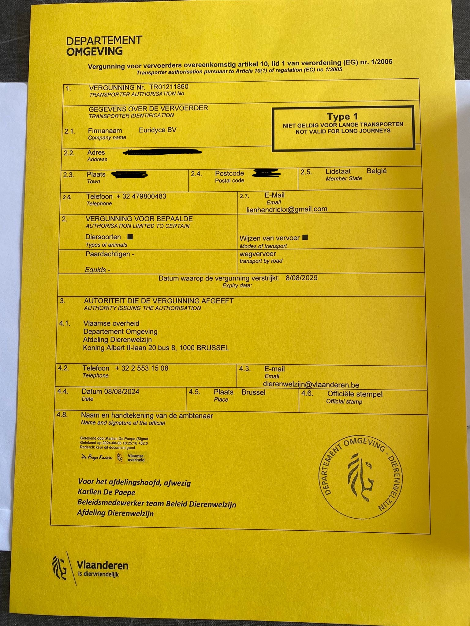 LHX beschikt over een vervoersvergunning uitgereikt door de FOD Mobiliteit, alsook een getuigschrift van vakbekwaamheid voor dierenvervoer uitgereikt door Dierengezondheidszorg Vlaanderen.